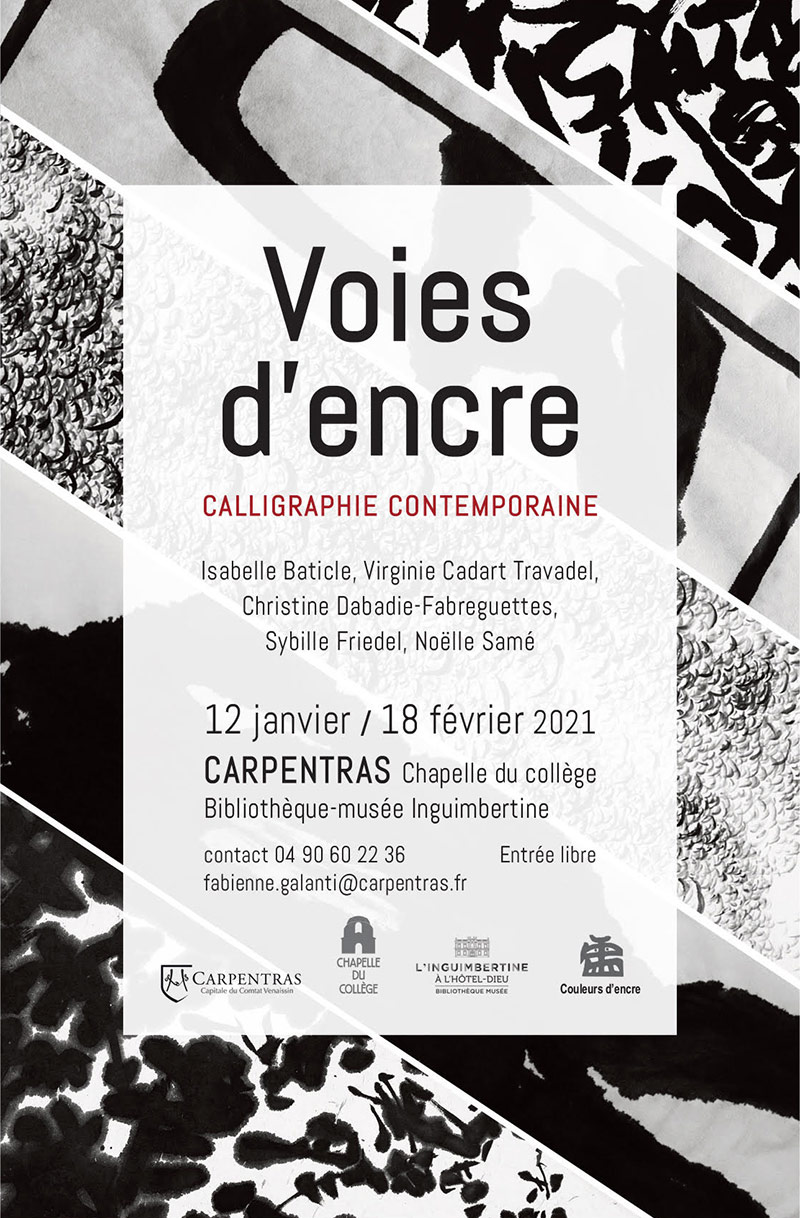 Chapelle du Collège et Bibliothèque Inguimbertine, Carpentras - Janvier / février 2021 En raison du contexte sanitaire, la Chapelle du Collège est ouverte aux écoles, ainsi qu'aux collectionneurs et professionnels de l'art, sur rendez-vous. En tant qu'artistes et/ou amateurs d'art, vous êtes donc les bienvenus, si le cœur vous en dit. Il faut simplement prendre … Lire la suite de Voies d’encre-Calligraphie contemporaine